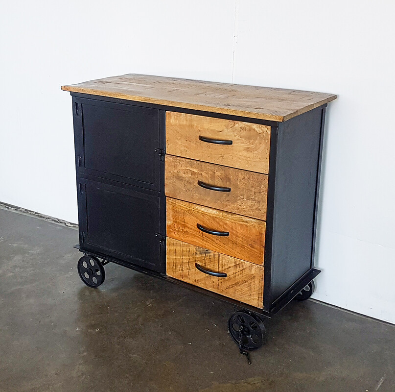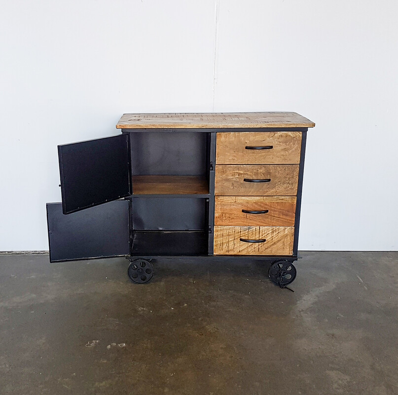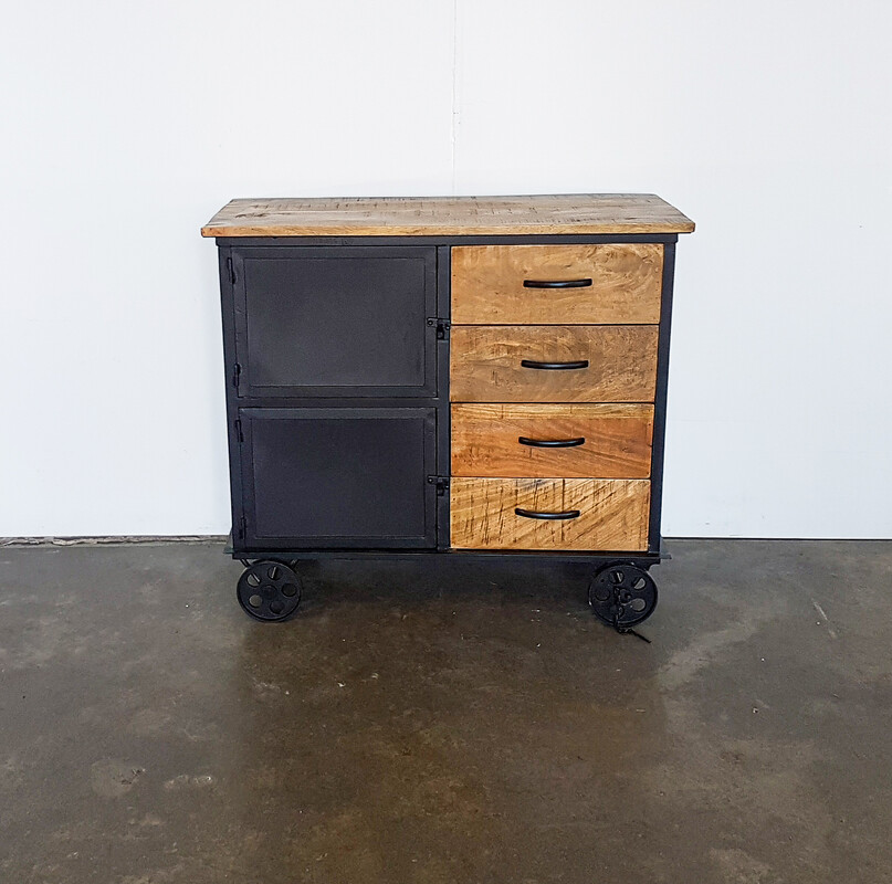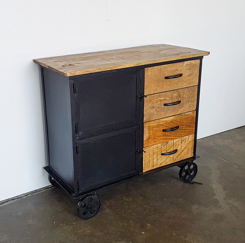 metal black on wheels industrial chest of drawers in metal and mango wood, modern, in new condition, for sale in industrial furniture | Teak Paleis